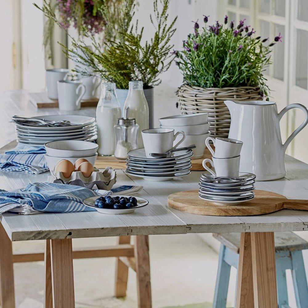 Серия Beja от компании Costa Nova включает стильную посуду и предметы сервировки, выполненные из высококачественной керамики и имеющие оригинальный современный дизайн. Предметы отличаются изящными линиями и декорированы темно-синим ободком, который символизирует архитектурный ландшафт Бежи и навевает ностальгические мысли о старинной эмалированной посуде. Лаконичный дизайн изделий придает любой сервировке изысканный, но повседневный уютный вид. Посуда из коллекции Beja пригодна для использования в духовом шкафу, микроволновой печи и морозильной камере. Предметы без труда очищаются от остатков пищи вручную или в посудомоечной машине.