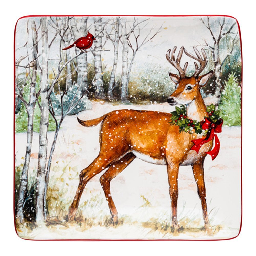 Красивые иллюстрирации лесных существ украшают керамические тарелки из коллекции Зимний лес от Certified International. Каждое изображение снежного пейзажа является произведением искусства от Сьюзан Уингет.