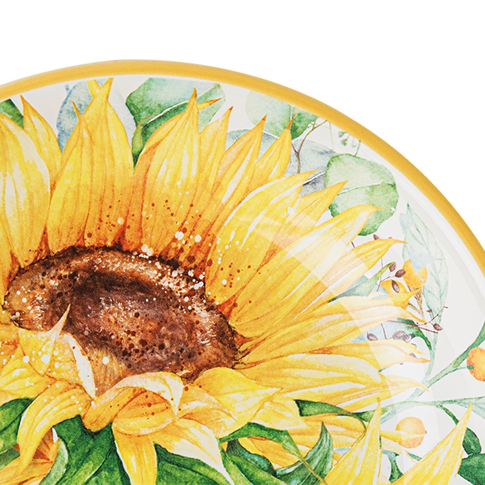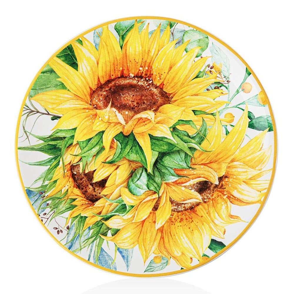 Тарелка из коллекции «Подсолнухи» разработана дизайнером-иллюстратором Нэнси Минк (Nancy Mink). Яркий цвет столовой посуды добавит солнце и радостную летнюю атмосферу вашей сервировке вне зависимости от сезона. Благодаря разнообразию красочной палитры, изысканной детализации цветков подсолнечника, где черный цвет только подчеркивает яркий флористический декор, посуда из коллекции «Подсолнухи» доставит радость и поможет оживить уютное семейное мероприятие или превратить вечеринку с друзьями в праздник.